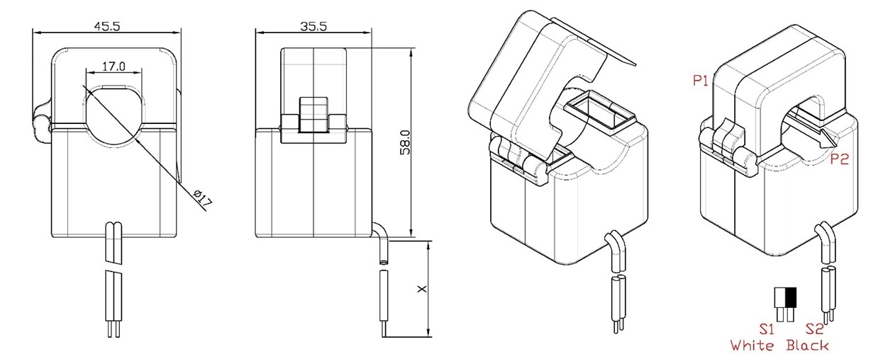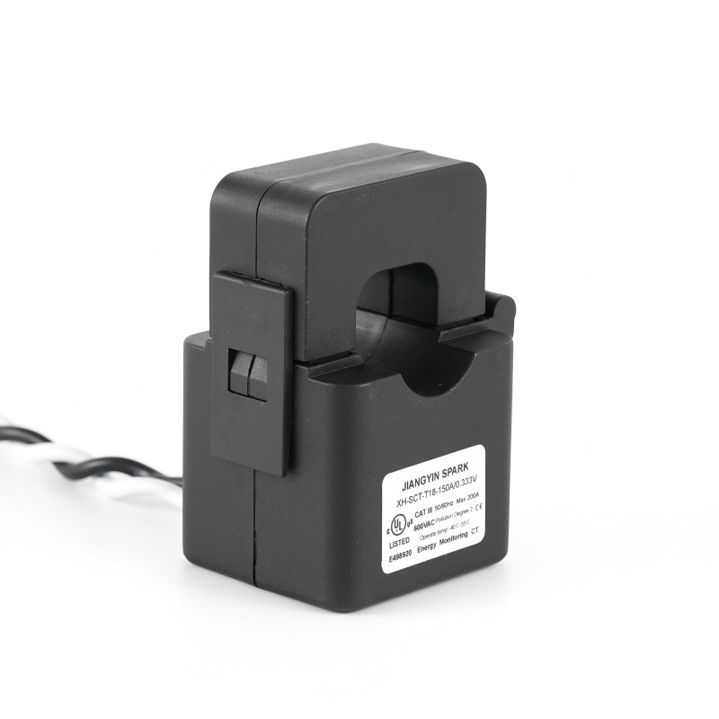 Jiangyin Spark XH-SCT-T18 energy monitoring split core current transformer, AC current from 1 to 120 Amps passing through the center conductor.Split core CTs are designed for fast and easy installation.The split core design permits non-contact current measurements through magnetic field induction without requiring that the primary wire be taken offline and disconnected for CT installation.Built in resistor provides 0.333V output ,this method permits a safer,easy and portable current measurement.