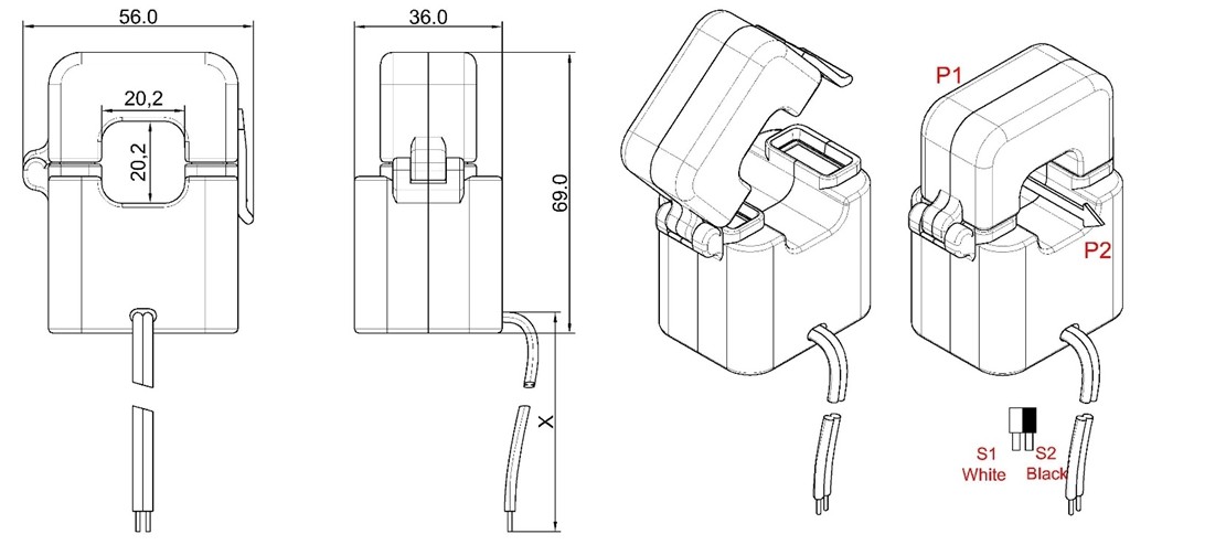Jiangyin Spark XH-SCT-T20 energy monitoring split core current transformer, AC current from 1 to 300 Amps passing through the center conductor.Split core Current Transformers are designed for fast and easy installation.The split core design permits non-contact current measurements through magnetic field induction without requiring that the primary wire be taken offline and disconnected for CT installation.Built in resistor provides 0.333V output ,this method permits a safer,easy and portable current measurement.